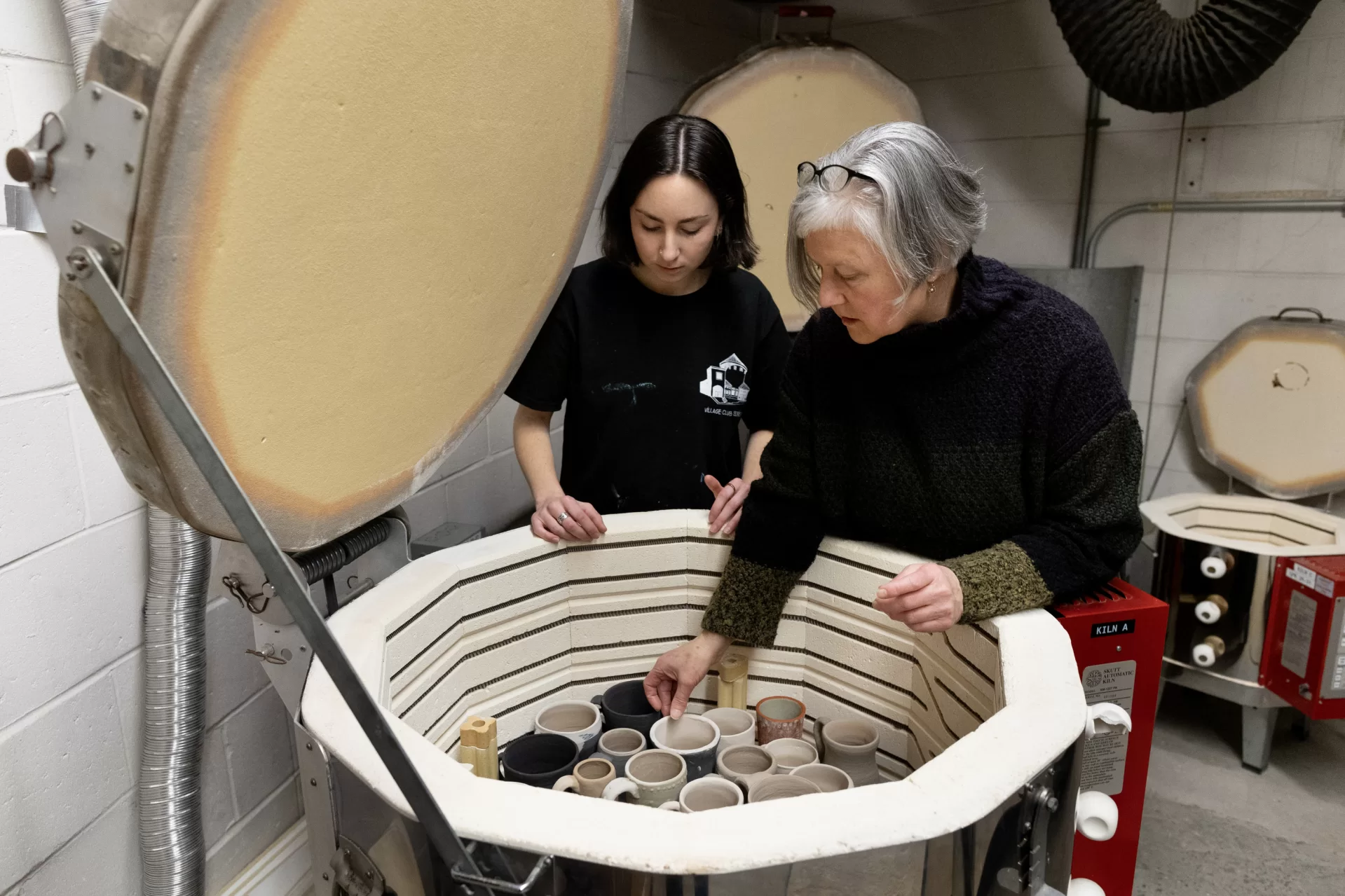 Alex Provasnik ’25 (left) of Arlington, Va., works at a kiln with Lecturer in Art and Visual Culture Susan Dewsnap in the ceramic studio in Olin Arts Center.