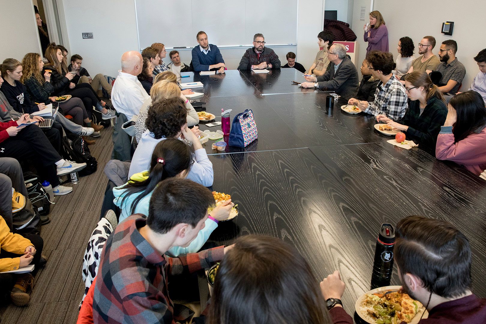 In March, Timothy Lyle of Iona College and Stephen Engel (at the far end of the table) packed a Commons seminar room with their research presentation “F***ing with Dignity.” The talk was presented in coordination with Bates’ production of “Angels in America: Millennium Approaches.” (Phyllis Graber Jensen/Bates College)
