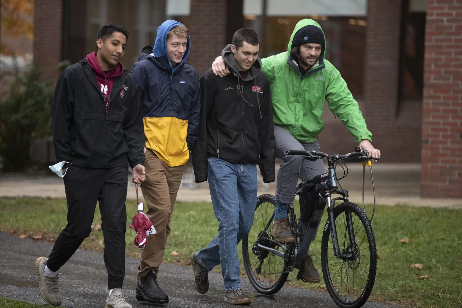 Ready for the weather with a range of rain gear, from left, Hark Lally ’22, Ben Fasciano ’23, Clay Hundertmark ’22, and Alex Platt ’23 walk past the Library Arcade on their way to Commons for breakfast.