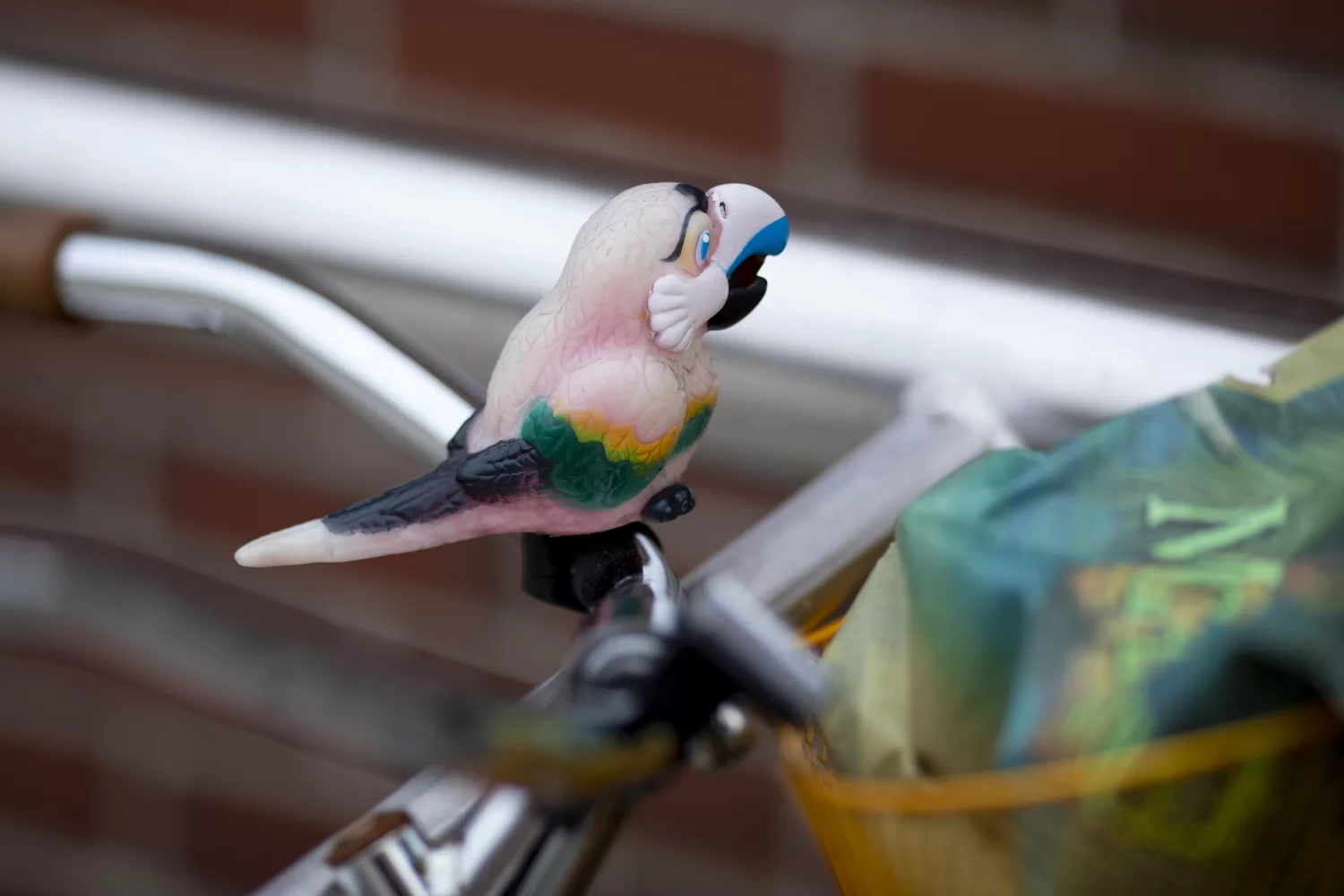 A horn in the shape of a bird, perched on a bicycle parked outside Ladd Library, brightens a cloudy vista.