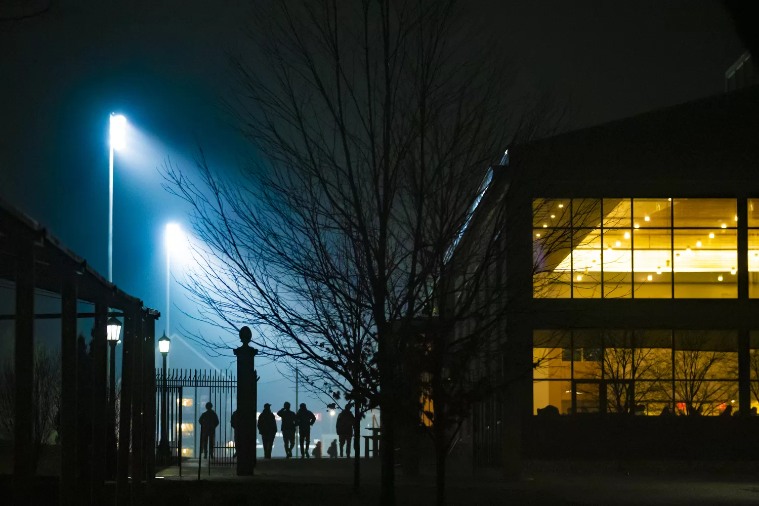 With an illuminated Garcelon Field as a backdrop, students stream toward Commons for dinner.