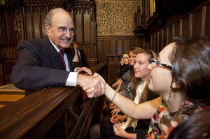 George Mitchell, whose Mitchell Institute provides scholarships to Maine students, greets Bates Mitchell Scholars on Oct. 27. Photograph by Phyllis Graber Jensen.