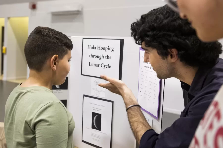 Teddy Rocque, 7, at moon phases station with Sadie Coleman ’25 and Serena McGrane