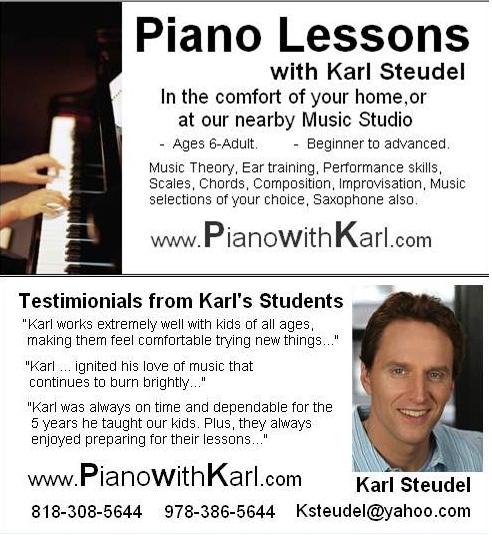 ![]() Piano with Karl | Karl Steudel ’87 | Education & Youth Programs | Burbank, CA (or Zoom) | Private Music Instruction (in-person or on Zoom). Piano, Saxophone, Music Theory, specializing in Composition, Improvisation. | Visit online. | Website |