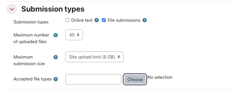 If the Accepted File Types field is left blank, students may submit any file type. To restrict the type of files a student may submit, click the Choose button.