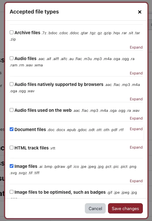 For a written assignment, instructors may wish to select Document Files and Image Files, for example. This will allow Word docs, PDFs, and JPEG/JPG, but will not allow file types that are less compatible with Lyceum, like HEIC.