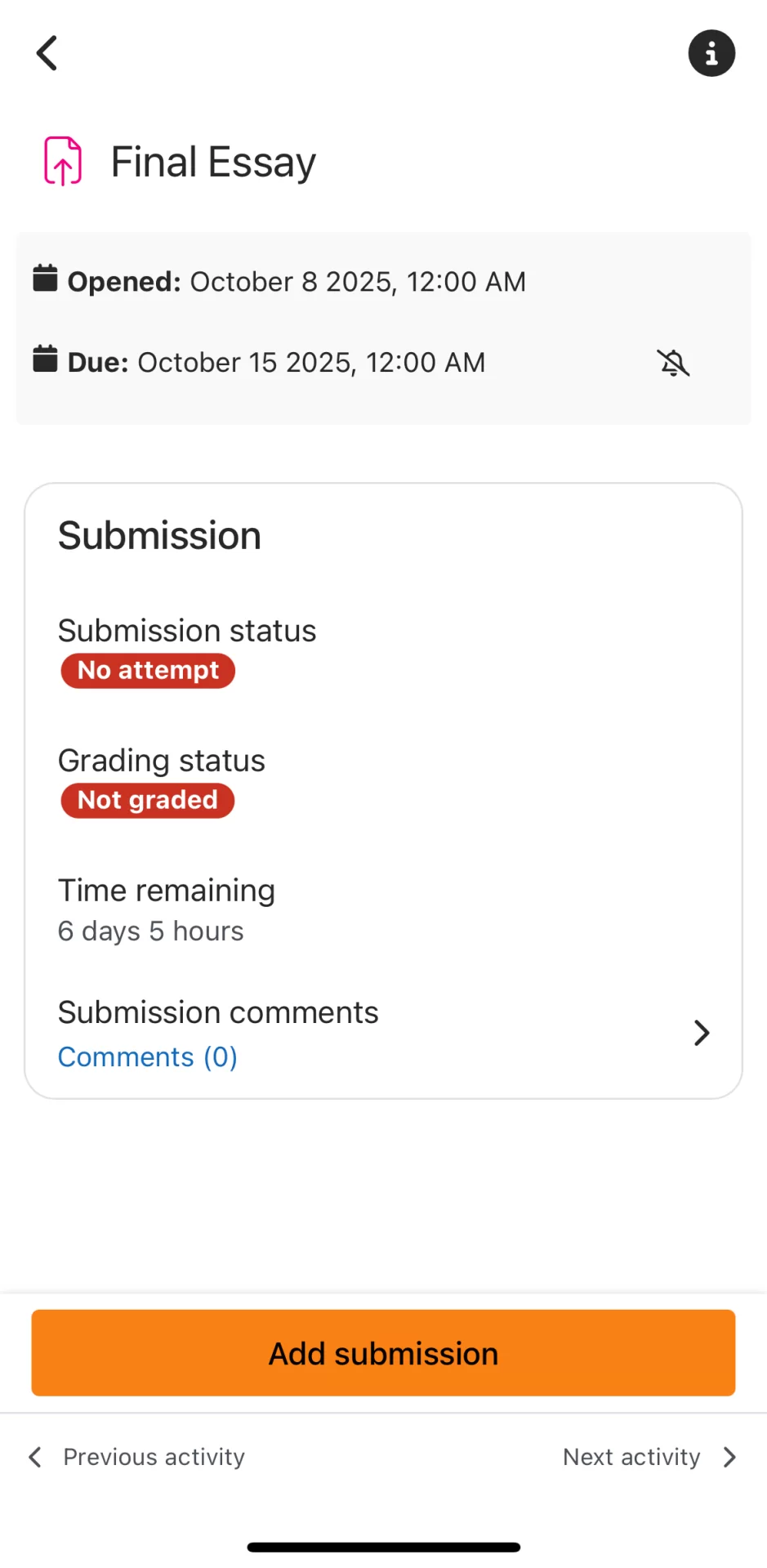- Navigate to your course and assignment in the app, as you would in a browser. Tap Add Submission.