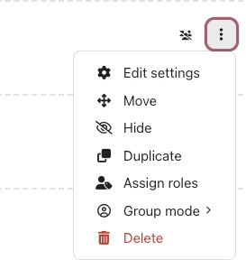 - This Assignment can be edited at any time after its creation. Turn on Edit Mode (mentioned above). Locate the Assignment you would like to edit and click the 3 dots to the right. Then select ‘Edit settings’ and this will bring you to your assignments settings form.