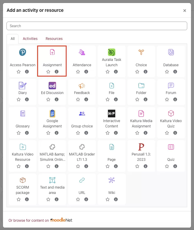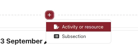 - Locate the section where you would like to add your Assignment activity and click the plus sign to add an activity or resource.