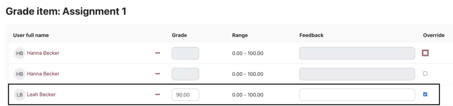 - You can select an Override action from the Actions menu, or check individual students’ grades one at a time using the checkboxes in the Override column.