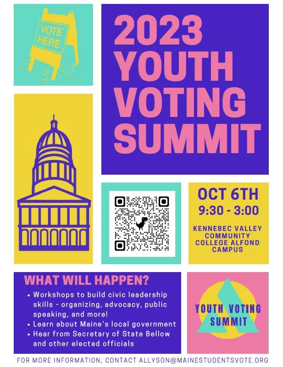 The Maine Youth Voting Summit is an annual day-long gathering of youth from Maine high schools and colleges, featuring workshops and speakers designed to build the civic leadership skills and capacities of Maine’s youth. This year, summit workshop topics included the future of Trans liberation in Maine, the stakes of Question 6 for the Wabanaki people of Maine, and a tutorial on how to write testimony and talk to your legislators. Speakers included Secretary of State Shenna Bellows and Representative Nathan Carlow.