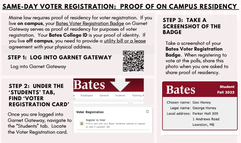 Anytime a student moves dorms, they must re-register to vote. Bates students who are U.S. citizens and over 18 years old by Election Day are eligible to register and vote in Lewiston. Maine has same-day voter registration, which allows students to update their registration or register to vote for the first time in Maine.