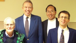 Thanks to the Sampson Lecture funds, we have been able to enjoy many great presentations by well known mathematical people for a number of years. The photo to the right was taken at the 2001 Sampson lecture. Pictured are Dick Sampson, George Andrews, Peter Wong and Warren Johnson.
