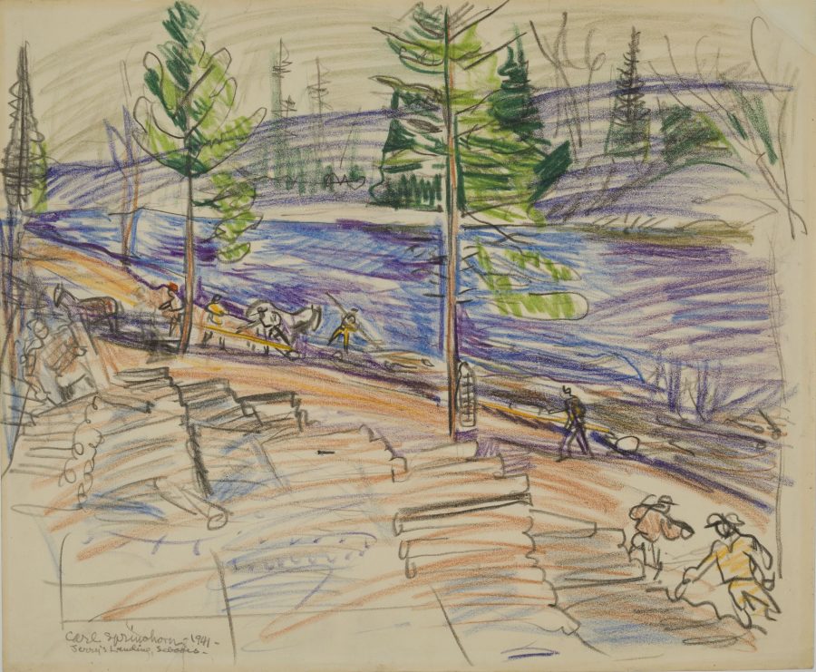 In her article “Carl Sprinchorn, American Artist from Sweden,” Mary Towley Swanson explains how, when first coming to the Maine woods in 1919, Sprinchorn was drawn to a climate and landscape similar to his home country of Sweden, and also to a settlement in Monson, ME where a friend of his mother lived (and where Swedish was most likely still spoken). For two years afterward, Sprinchorn resided in the Maine North Woods, executing a number of landscape paintings and drawings of woodsmen, lumberjacks, and horse teams, documenting the life and work of the log drives. This was not Sprinchorn’s only sojourn in Maine, and he would return sporadically from 1937 through the summer of 1952, residing in the Patten/Shin Pond area, and forming lasting relationships with the farmers and woodsmen who inspired his work.