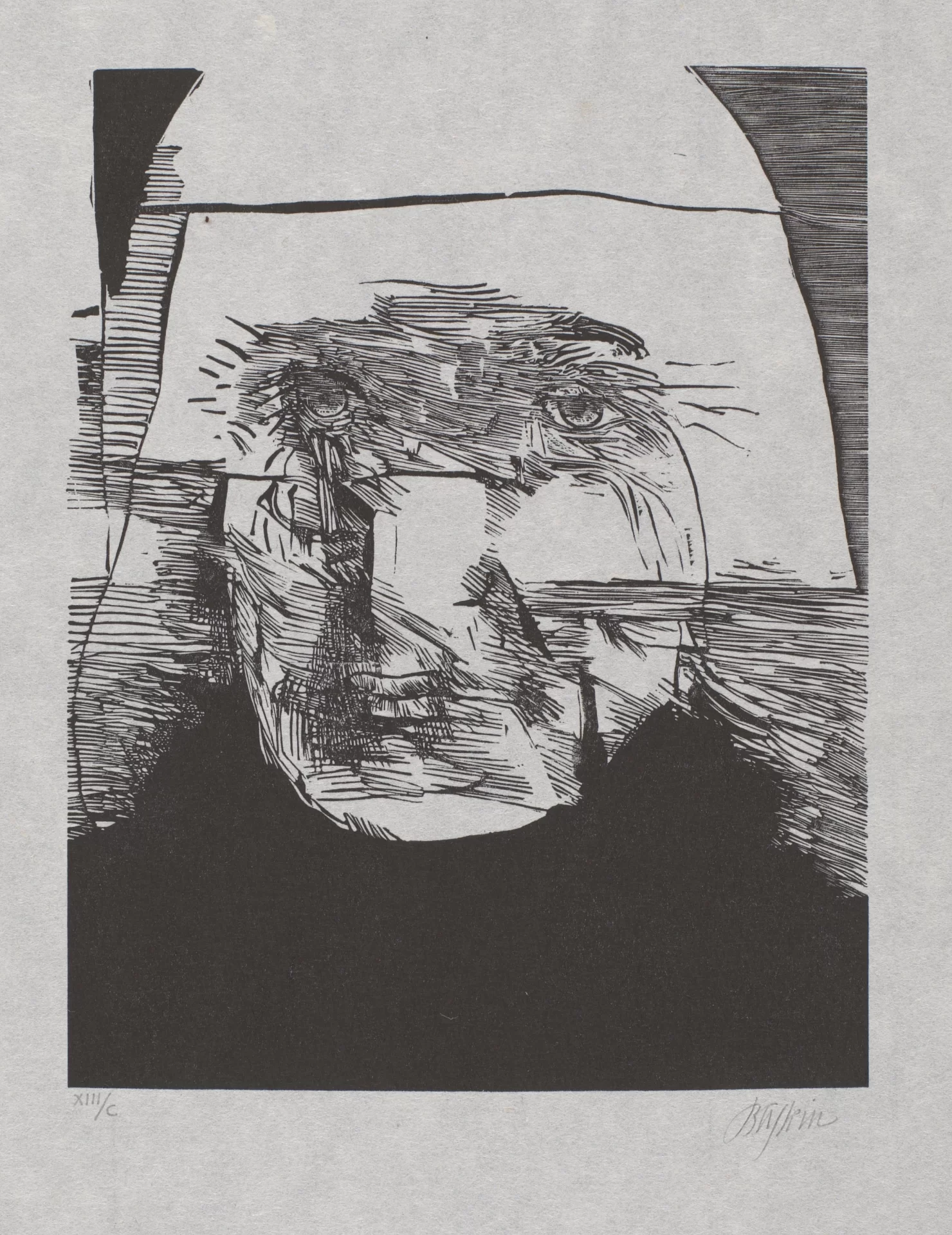 Baskin specialized in sculpture, drawings, and prints. Known for his Expressionist renderings and historical subjects, Baskin typically exaggerated his subjects’ features. In his portrait of Rodolphe Bresdin, for instance, he used a bright green to depict the printmaker’s hat. The fluffy texture of the subject’s hair and beard is created through dots, while the hat is rendered with dense vertical hatching and the clothes are drawn with curvilinear, economical lines. The difference in the lines make the texture of each part distinctive from each other. One of Bresdin’s eyes is higher than the other, which is upside down. This sketchy, somewhat surreal quality adds uniqueness to Baskin’s depictions of famous artists from past eras and unearths qualities beyond realistic physical likenesses. Baskin attended many institutions, including New York University, Yale University, the Academie de la Grande Chaumière in Paris, the Accademia di Belle Arte in Florence, and the New School. He taught at Smith College and Hampshire College. His works are collected by many museums, including the Museum of Modern Art, New York; Smithsonian American Art Museum, Washington DC; and Victoria and Albert Museum, London.