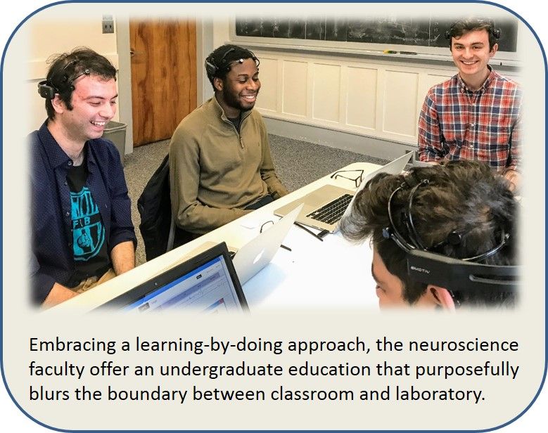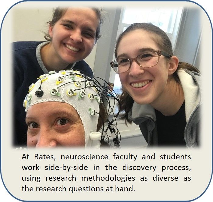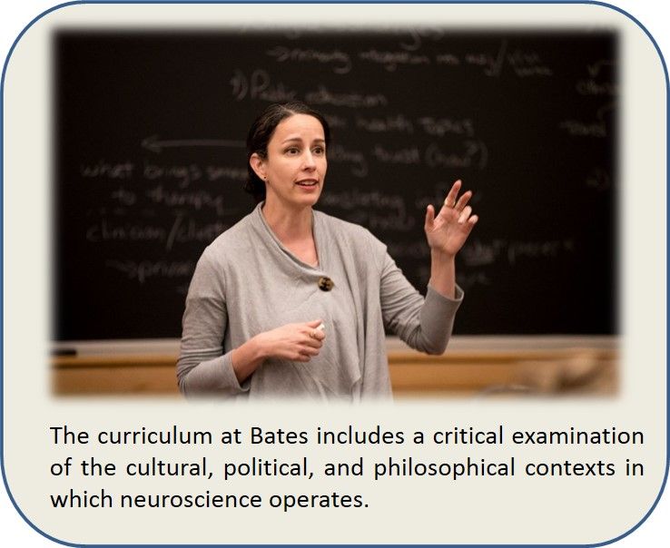 The neuroscience program fosters an active, learning-by-doing approach, as students conduct meaningful and innovative research at several points in their academic career, beginning in laboratory sections as supplementation to classroom learning and culminating with rigorous, independent research during the senior capstone experience. Another key goal of the neuroscience curriculum at Bates is to deepen capacity for a critical examination of the historical, political, and ethical contexts in which neuroscience operates such that students probe what it means to be a responsible consumer and producer of neuroscientific knowledge. By interrogating how neuroscience is done, for whom, by whom, for what purpose, and with what consequences, students come to reflect upon their own habits of mind, value systems, and politics of participation.
