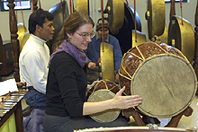 In its third year at Bates, the Gamelan Mawar Mekar (“blossom of inspiration”) has 13 members. The gamelan — a term referring to both the genre and the musical ensemble itself — is the traditional orchestra of Java and Bali. It’s a percussion-based music whose systems of pitch and timing are very different from the systems familiar to Americans.