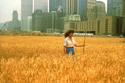 — Images of two of Denes’ land reclamation projects, including Wheatfield — A Confrontation, for which the artist grew wheat on a site in New York City;