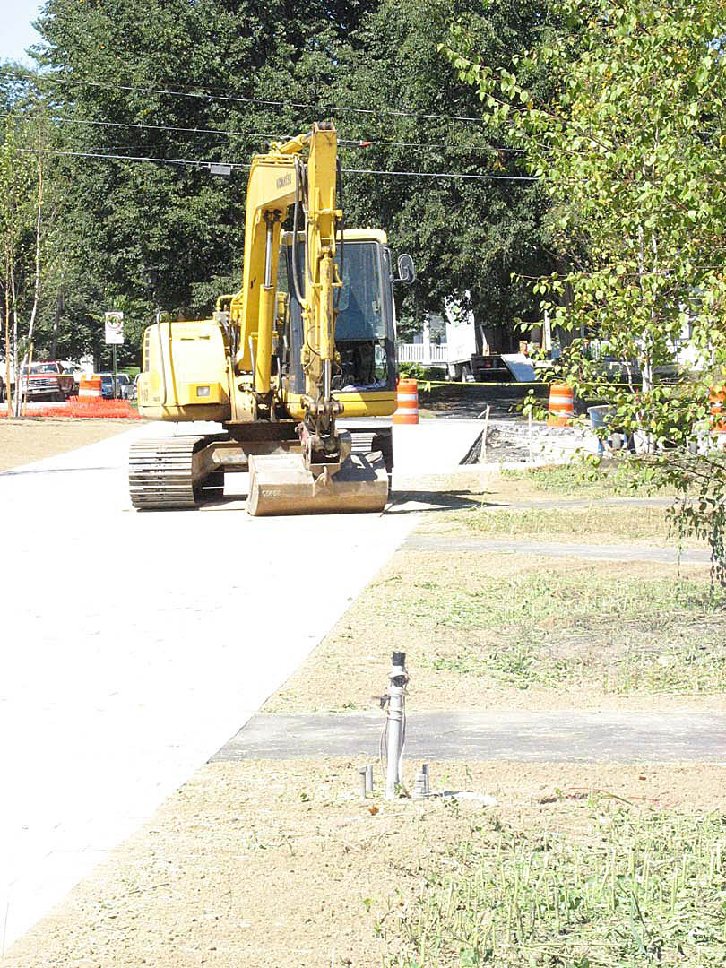 With work winding down during the last week of August on steam vault No. 1, in front of Pettengill, workers went full speed ahead with the cosmetic work that turns a bunch of dirt into an Alumni Walk: grading, paving, planting. In fact, one of the walk’s two main pathways — the narrower northern lane — has been blacktopped all the way to its terminus near the new Commons.