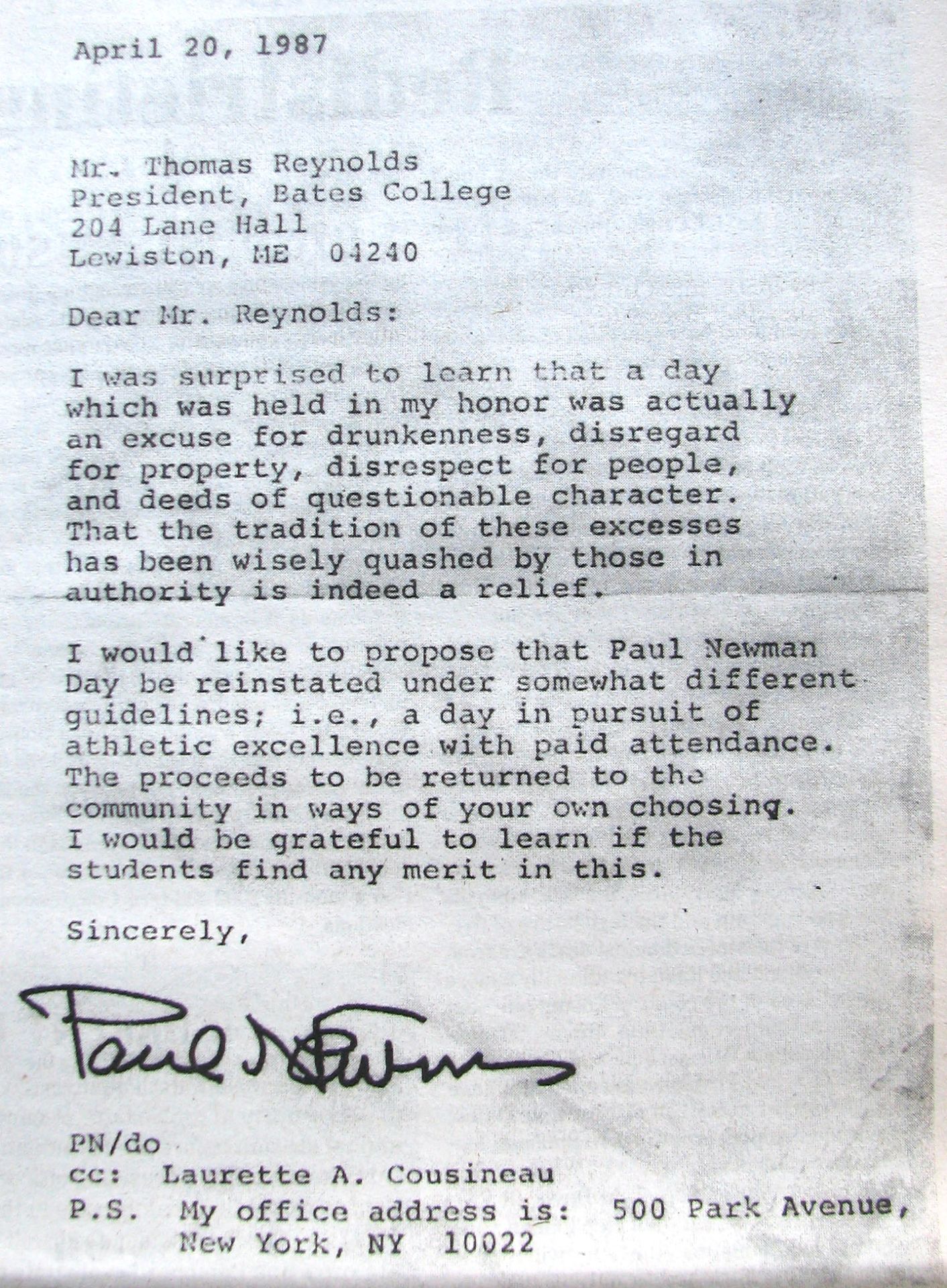 Above is the 1987 letter from actor Paul Newman to then-President T. Hedley Reynolds, as reprinted in a 2001 issue of The Bates Student.