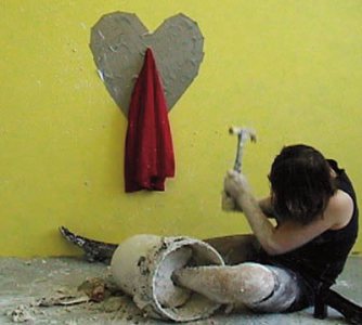 In her 2004 video of that performance, My Love Is an Anchor, you hear Gilmore’s grunts and groans as she relentlessly beats at the plastic bucket. The same sort of guttural venting occurs in another of Gilmore’s early videos, Main Squeeze, in which she tries to crawl through a small, wood-framed tunnel. A New York Times reviewer called Gilmore’s videos “wacko,” yet despite a certain “batty, sadomasochistic streak…I like them a lot.”