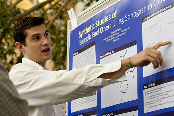 Travis Brown ’11 of East Greenwich, R.I., explains his chemistry research at the 2011 Mount David Summit. Photograph by Phyllis Graber Jensen/Bates College.