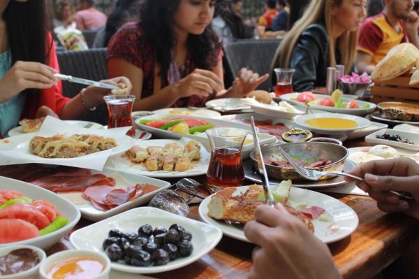 A typical Turkish breakfast with generous spreads of cheese, cold meats, olives, bread, etc. Most Turks usually have breakfast with tea in these wasp-waisted glasses. And they drink it throughout the day over conversation or with meals. Phillip Dube '16/Bates College.