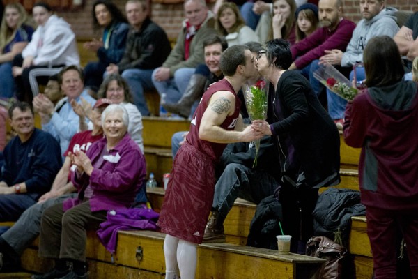With a bouquet and a kiss, Luke Matarazzo '14 of Shelton, Conn., greets his mother courtside in Alumni Gym prior to his final game for Bates. (Phyllis Graber Jensen/Bates College)