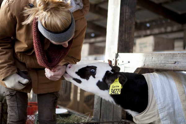 A student in the course “Literature of Agriculture” joins a field trip to the R.E Hemond dairy farm. Jane Costlow, Clark A. Griffith Professor of Environmental Studies, teaches the course. (Sarah Crosby/Bates College)