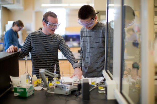 Visiting Assistant Professor of Chemistry Ryan Nelson, left, assists a student in a lab for CH/ES 108B, "Chemical Reactivity in Environmental Systems." (Phyllis Graber Jensenj/Bates College)