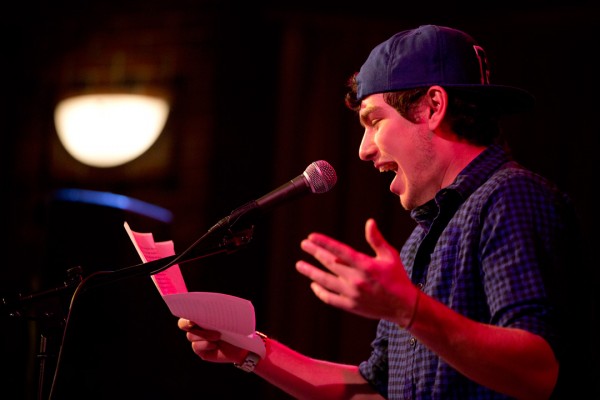 Jeremy Mack '16 of Brooklyn performs his poetry at the the Benjamin Mays Center as part the Village Club Series' Student Poetry Slam. (Phyllis Graber Jensen/Bates College)