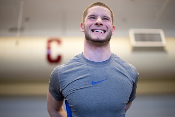 Quarterback Nick LaSpada ‘17, a sociology-major-to-be, of Billerica, Mass., does glute-ham raises in the Davis Fitness Center during an off-season workout with his teammates. (Phyllis Graber Jensen/Bates College)