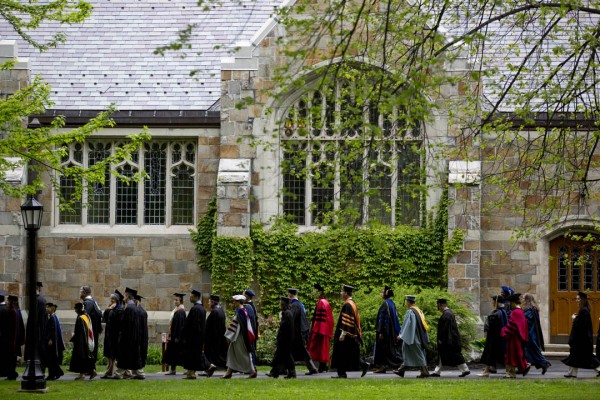 Led by student marshals from the Class of 2015, the academic procession moves from Alumni Walk to the Quad. Here, the seniors walk between Hathorn and Parker halls.
