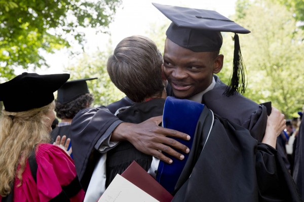 After the ceremony, a faculty member embraces Josh Ajamu ’14 of Breinigsville, Pa.