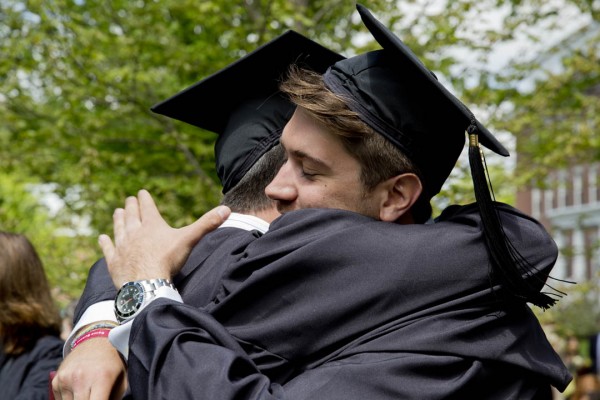 Dan Remillard ’14 of Hanover, N.H., shares a hug with Sonja Favaloro ’14 of Morrisville, Pa.