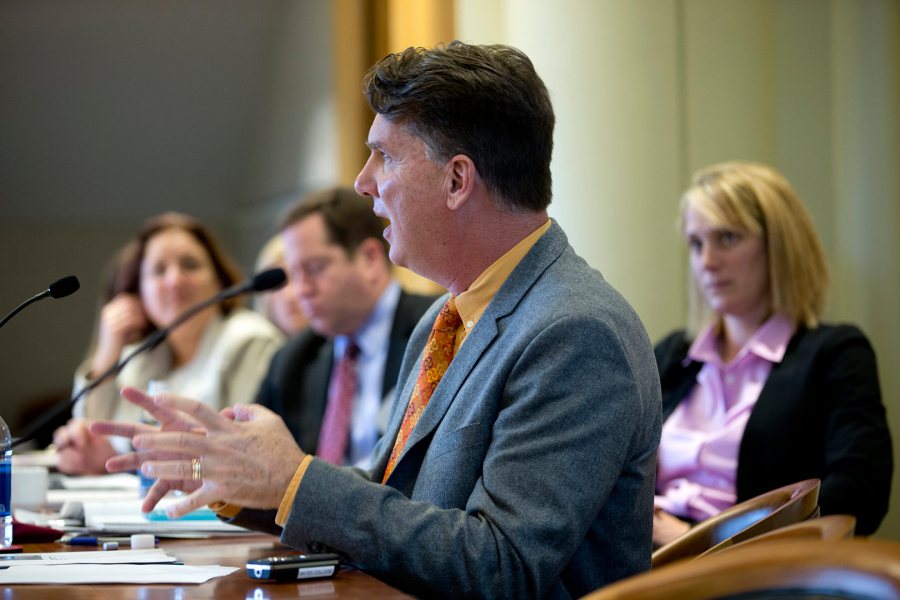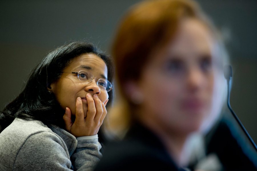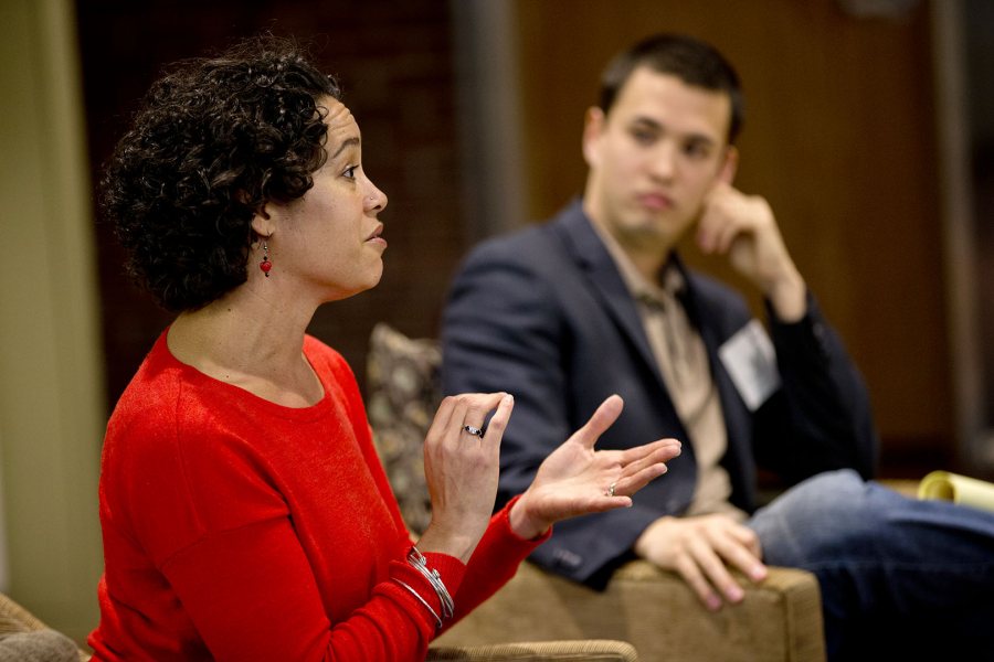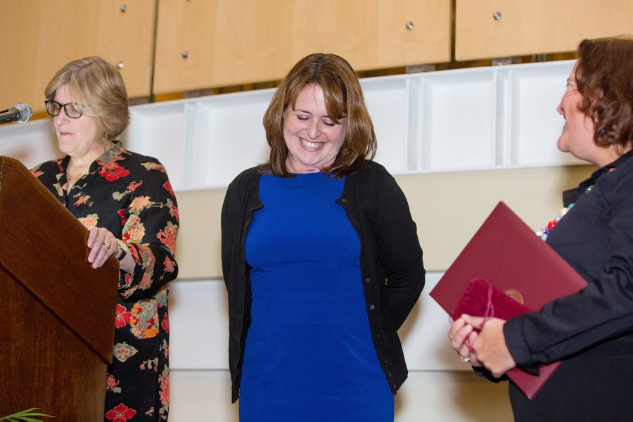 Jeff Sturgis ’69, recipient of the David G. Russell Award for outstanding admission volunteer work, stands by as Dean of Admission Leigh Weisenburger reads the citation and President Clayton Spencer listens. (Rene Minnis for Bates College)