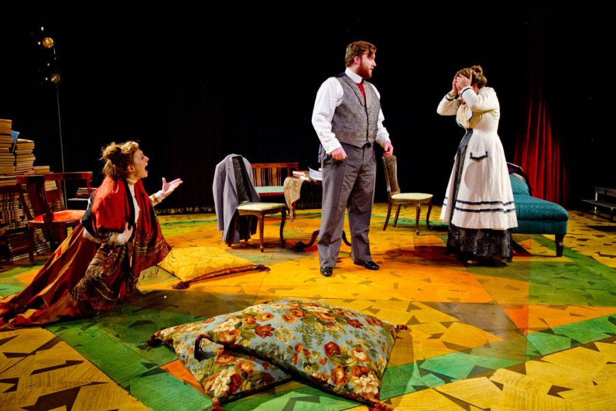 From left, Colette Girardin ’16 of East Moriches, N.Y., Ciaran Walsh ’15 of Washington, D.C., and Hanna Allerton ’15 of New York City perform in the play “The Summer in Gossensass” in Gannett Theater. The production was Allerton's senior thesis project. (Phyllis Graber Jensen/Bates College)