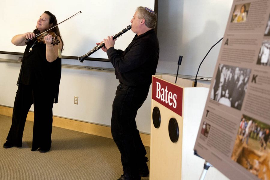 Rabbi Sruli Dresdner, affiliated chaplain at Bates, and Lisa Mayer perform klezmer music at “All Points North,” a presentation of Lewiston-Auburn immigrant stories sponsored by the Harward Center for Community Partnerships. (Phyllis Graber Jensen/Bates College)