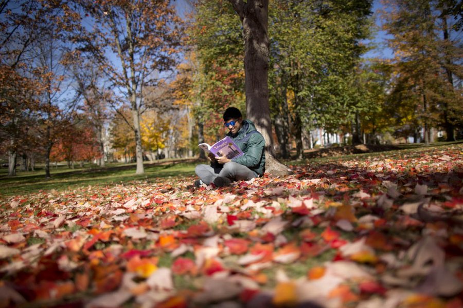 Zuhayr Reaz '16 of Dhaka, Bangladesh, studies on the Historic Quad. (Phyllis Graber Jensen/Bates College)