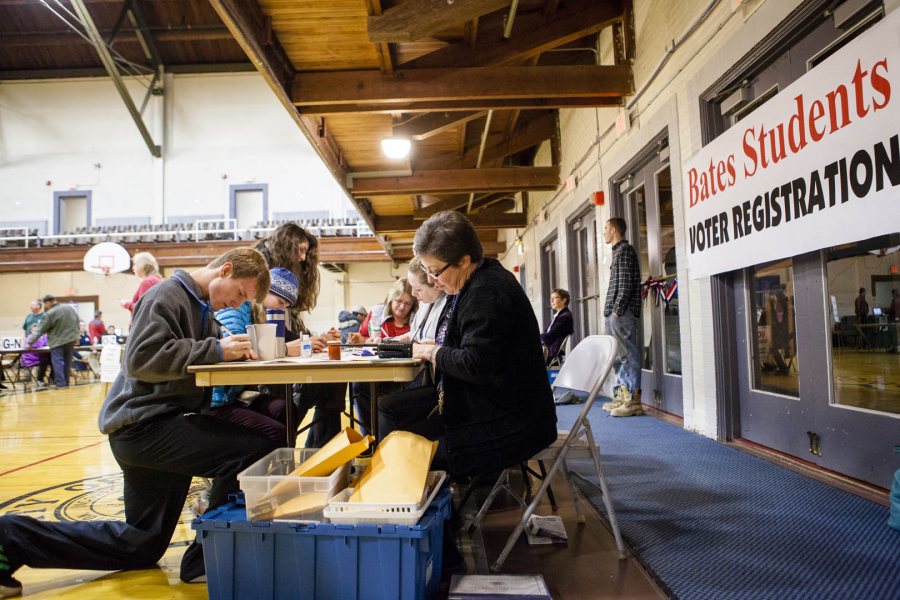 Thorn Merrill '18 of Morrisville, Vt., registers to vote at the Lewiston Armory on election night. (Sarah Crosby/Bates College)