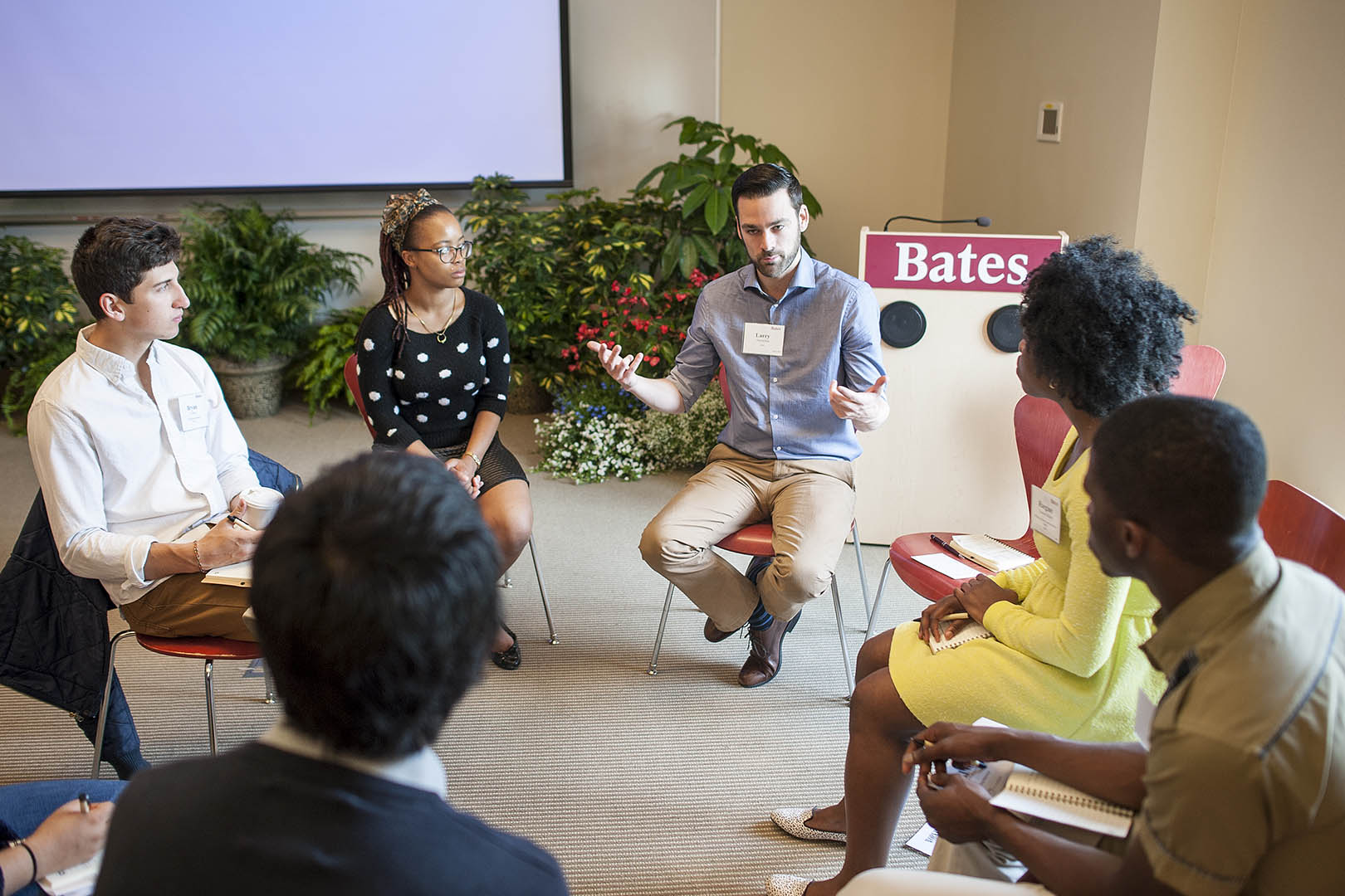 Larry Handerhan ’05 discusses his career path with students during the May 2015 “Working Weekend” program, co-sponsored by the Purposeful Work initiative and the Office of Equity and Diversity. (Josh Kuckens/Bates College)