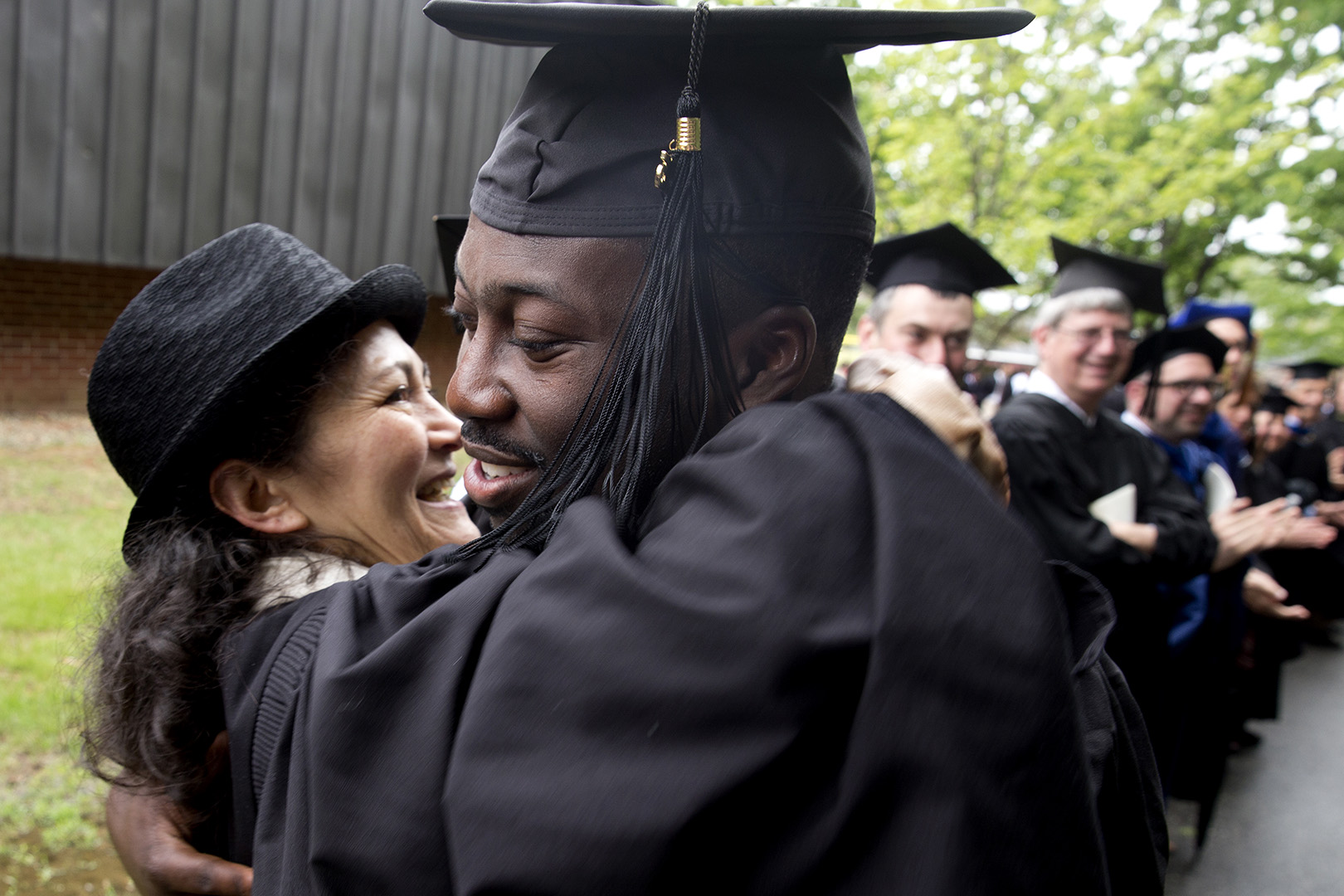 Outside of Merrill Gym, as the graduates march past the faculty during the recessional, Daniel Oyolu, a Spanish major from Houston, receives a congratulatory embrace from Associate Professor of Spanish Claudia Aburto Guzmán. (Phyllis Graber Jensen/Bates College)