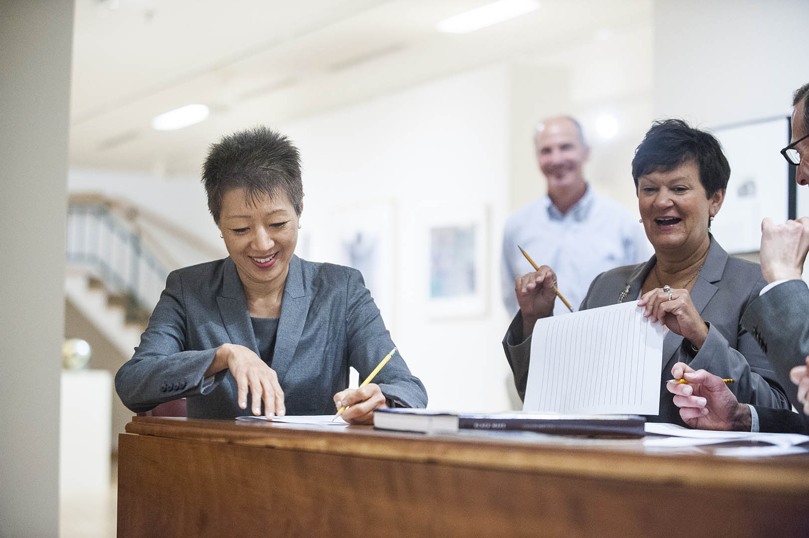 National Endowment for the Arts Chairman Jane Chu visits the Bates College Museum of Art on Aug. 11, 2015. Also shown: museum Curator Bill Low, at rear; Julie Richard, executive director of the Maine Arts Commission; and at extreme right, Matt Auer, Bates dean of the faculty. (Josh Kuckens/Bates College)