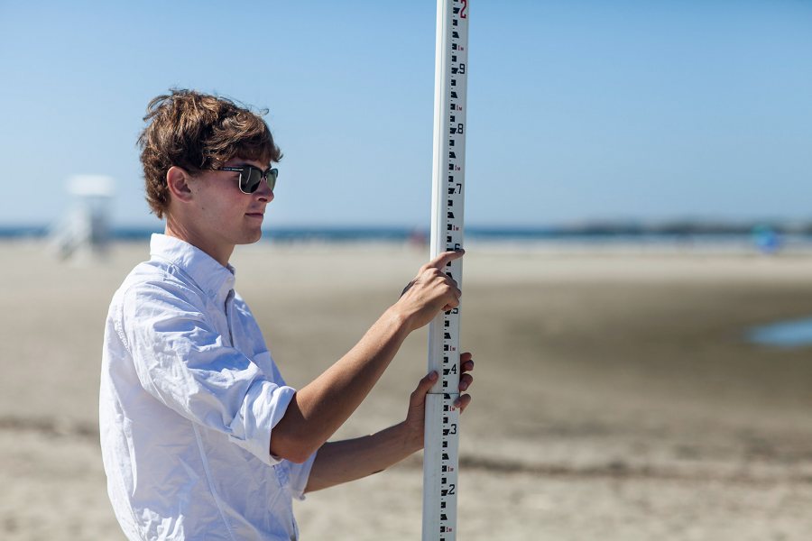 Hillenbrand ’17 holds a stadia rod, which is used in tandem with an autolevel to measure the elevation change between two points on the beach.