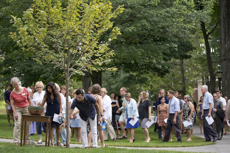 Faculty, staff, and students take turns pouring cups of water, drawn from Lake Andrews, onto the roots of a new tree on the Historic Quad.