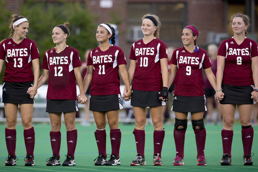 Proud and hopeful, members of the field hockey team hold hands prior to introductions for their first game, vs. Husson University.