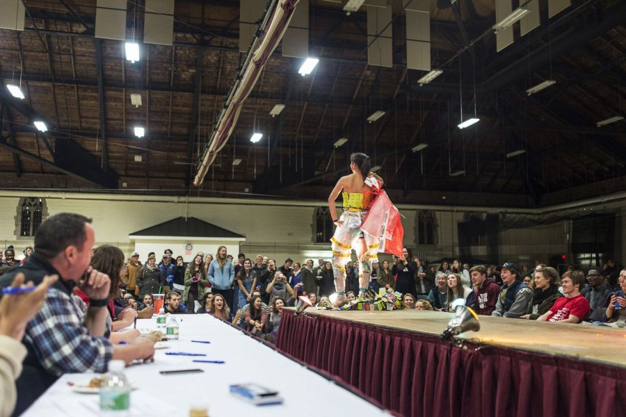 A regular designer for the annual Trashion Show, Tejada, of Mount Kisco, N.Y., looked at his model, Elise Krims ’16 of Concord, Mass., on Wednesday night and quipped that “if Barbarella and Madonna had a child, this would be her.”
