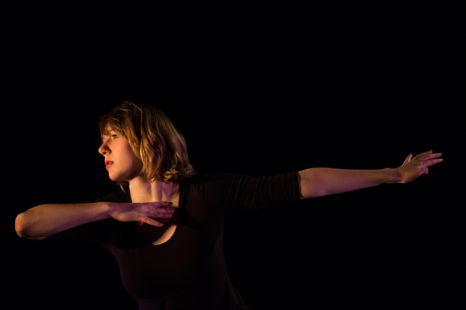 In 2014, Katie Ailes ’14 performs “Homing” on the Schaeffer Theatre stage, a work she choreographed for her senior thesis in dance. (Phyllis Graber Jensen/Bates College)