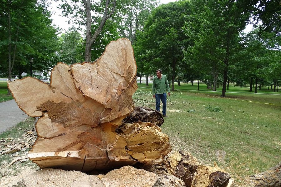 Another sign of fungus was the large burls on its trunk, “very sought-after by bowl turners because they have beautiful wood grain,” says Huggett, who recalls cases of burl-stealing in Jamaica Plain, Mass., a few years ago.