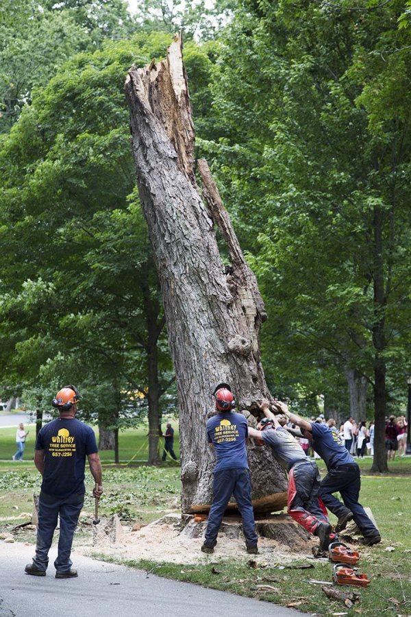 “The hobbit-ness of it — so gorgeous,” said Professor Emerita of Biology Sharon Kinsman as she watched a local tree service remove a huge, old sugar maple that had toppled over the previous evening, July 28, during a thundershower.